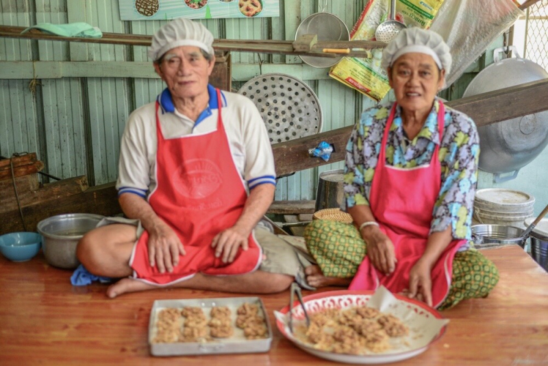 มาถึงบ้านเกาะเกิดแล้ว อีกที่หนึ่งถ้าไม่แวะไปเยี่ยมถือว่าผิด!!..นั่นคือ “บ้านป้าสละและลุงสมนึก” เพราะที่นี่เป็นแหล่งทำขนมงานมงคลที่เลื่องชื่อ โดยเฉพาะขนมสามเกลอ และขนมกง ที่ลูกค้าในพื้นที่มักจะมาสั่งเพื่อนำไปใช้ในงานพิธีมงคลต่างๆอยู่เป็นประจำ นอกจากนี้ในแต่ละวันป้าสละยังทำขนมไทยโบราณสลับสับเปลี่ยนกันไปเรื่อยๆ แต่ที่ทำอยู่เป็นประจำ ก็จะเป็นขนมกง ขนมสามเกลอ ขนมหม้อแกง ขนมต้ม ขนมตะโก้ ขนมเปียกปูน ถั่วแปบซึ่งเป็นสูตรโบราณโดยทั้งสิ้น รสชาติจึงหอมละมุมไม่หวานแสบคออร่อยสมคำล่ำลือจริงๆ